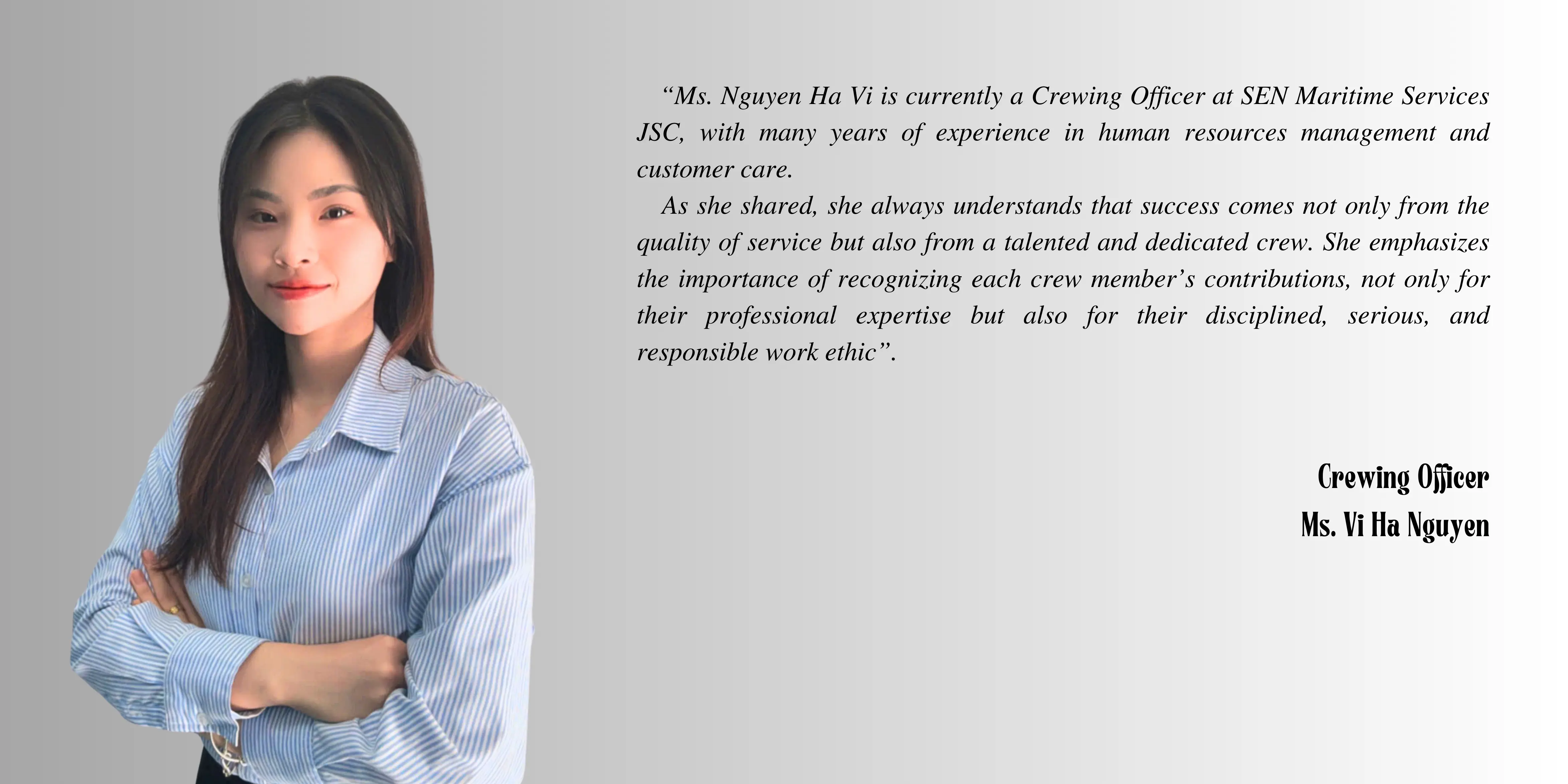 Ms. Uyen Luong Tran is currently the Crewing Officer at the Sen Maritime Services JSC